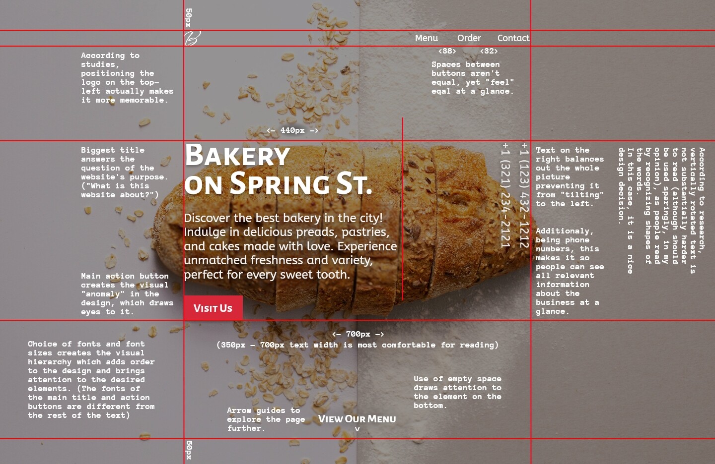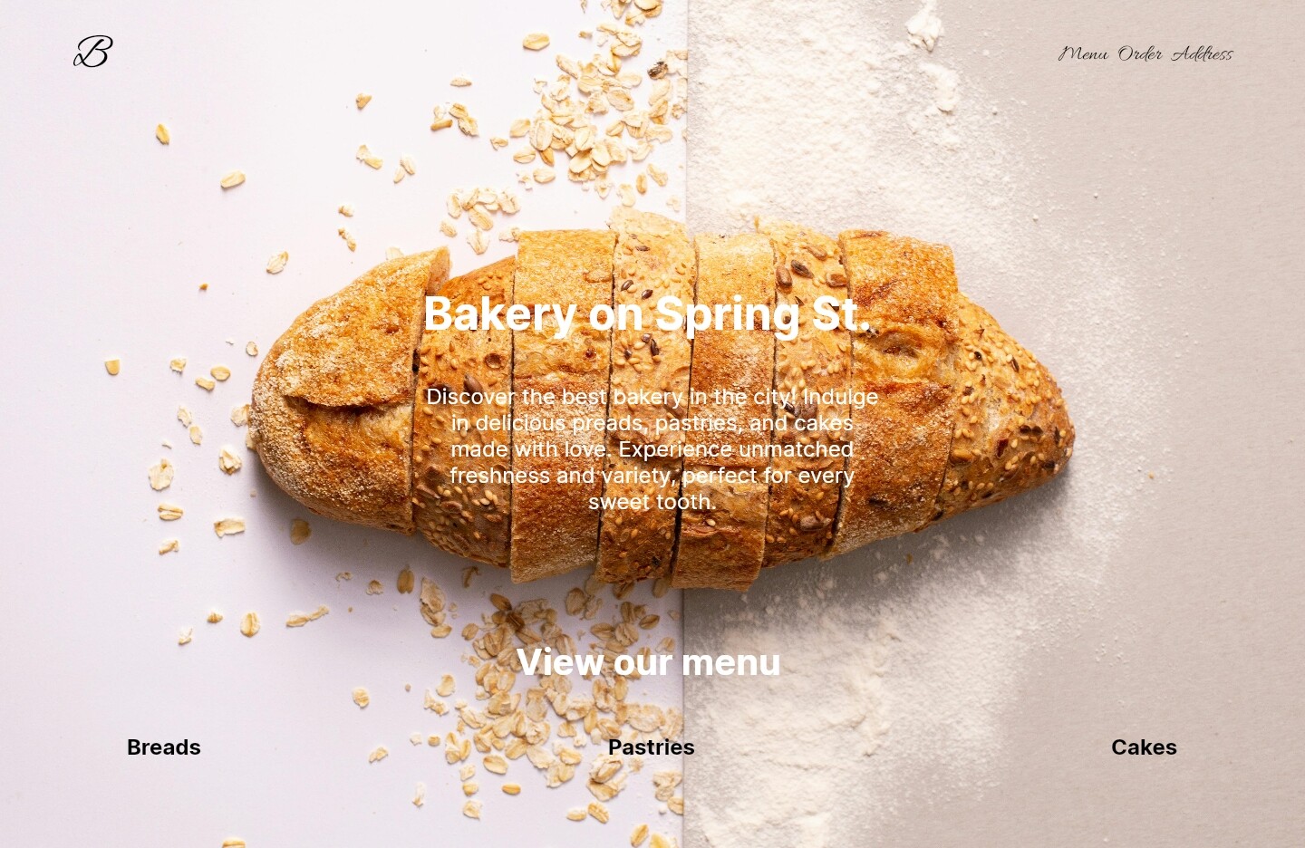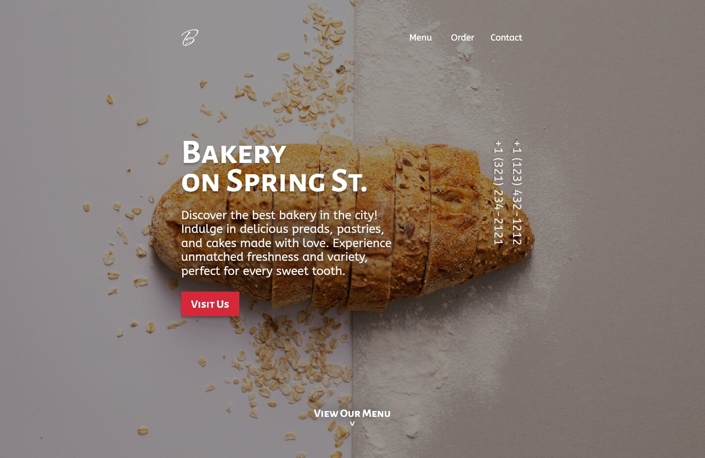 The design has a clear purpose and communicates it skillfully with the main title and highlighted buttons which guied the user to explore bakery offerings further.